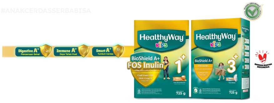 HealthyWay KIDS dengan formula Bioshield A+ yang memiliki FOS Inulin Tertinggi di antara susu pertumbuhan lainnya untuk dukung kesehatan pencernaan si kecil. Dilengkapi juga dengan Tinggi vitamin C, D3, E, Zinc untuk daya tahan tubuh, Cod Liver Oil, DHA, ALA, LA untuk kecerdasan optimal si kecil. Dengan pencernaan yang sehat, daya tahan kuat, dan kecerdasan optimal, dukung si Kecil menjadi ANAK CERDAS SERBA BISA.