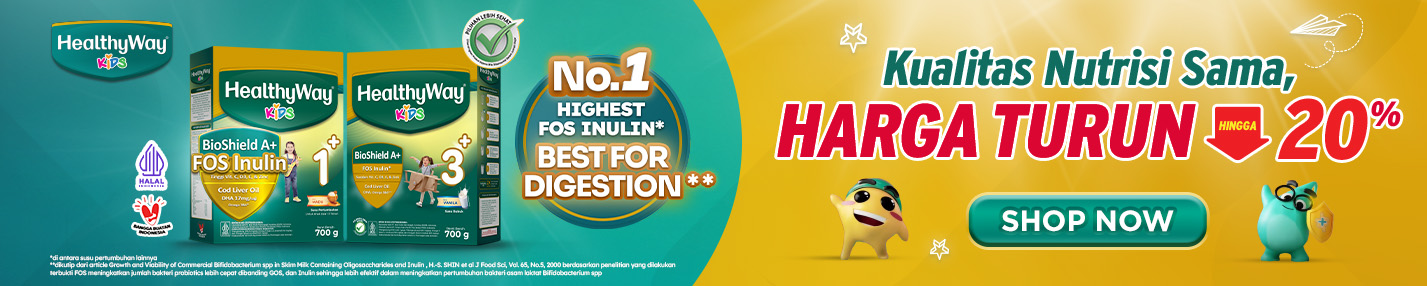 HealthyWay KIDS, susu pertumbuhan yang dilengkapi BioShield A+ dengan FOS Inulin tertinggi di antara susu lainnya, yang baik untuk menjaga kesehatan sistem pencernaan, daya tahan tubuh kuat, dan cerdas optimal untuk dukung si kecil menjadi ANAK CERDAS SERBA BISA.